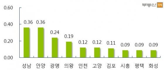 경기·인천 주요지역 주간 매매가격 변동률(자료제공:부동산114)경기·인천은 △성남(0.36%) △안양(0.36%) △광명(0.24%) △의왕(0.19%) △인천(0.12%) △고양(0.12%) △김포(0.11%) △시흥(0.09%) △평택(0.09%) △화성(0.09%) 순으로 상승했다. 성남은 재건축 이주가 진행 중인 신흥동 주공의 매매거래가 활발하고, 안양은 박달실리콘밸리 조성 사업이 본격 추진되는 등 호재로 매매 문의가 늘었다. 광명은 거래가 많지 않으나 매물이 귀하다.