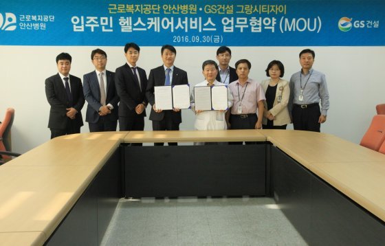 지난 9월 30일 근로복지공단 안산병원과 GS건설 그랑시티자이가 입주민 헬스케어 서비스 업무협약(MOU)을 맺고 관계자들이 기념 촬영을 하고 있다.