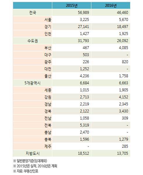 부동산인포에 따르면 11월 전국에서 분양예정인 물량은 4만6460가구로 조사됐다.(임대 제외) 이는 공급이 대거 쏟아졌던 지난해 같은 기간보다 감소한 수준이지만, 2014년 11월 3만9830가구보다 16.6% 증가한 수치다. 지역별으로 서울, 부산, 강원, 경북 등은 작년 11월에 비해 분양 물량이 늘었다.