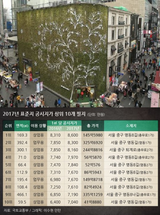 국토교통부가 22일 발표한 전국 표준공시지가에 따르면 서울 중구 명동8길 네이처리퍼블릭 부지(169.3㎡)의 ㎡당 가격이 8600만 원에 달했다. 3.3㎡로 계산하면 2억8380만 원, 공시지가대로 이 땅을 사려면 145억5980만 원이다. 이 점포의 지난해 표준지공시지가는 ㎡당 8310만 원으로 지난해에 비해 5억원 넘게 올라 3.5% 상승했다.