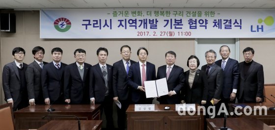 김상엽 LH 서울지역본부장(왼쪽 일곱 번째)과 백경현 구리시장이 27일 구리시청에서 지역개발 기본협약(MOU) 체결 후 기념촬영하고 있다. LH 제공한국토지주택공사(이하 LH) 서울지역본부와 경기도 구리시가 지역개발 기본협약(MOU)을 27일 체결했다.