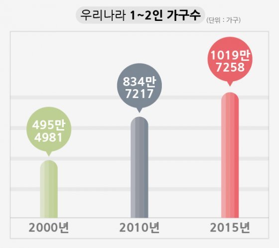 통계청에 따르면 지난 2015년 우리나라 1~2인 가구수는 1019만7258가구로 5년 전인 2010년 834만 7217가구에 비해 22.16% 증가했다. 지난 2000년 1~2인 가구는 495만4981가구에 불과했지만 2010년엔 834만 7217가구로 늘어났고, 2015년 들어서는 1000만 가구를 돌파하며 전체 가구수 1911만 1030가구의 절반을 넘어섰다.