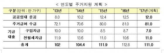 국토교통부는 주거정책심의위원회 심의를 거쳐 2017년 주거종합계획을 수립했다고 8일 밝혔다. 공공임대주택은 건설임대 7만가구, 매입·전세임대 5만가구 등 총 12만가구가 공급된다. 공공임대를 비롯해 주거급여, 전월세 자금지원 등 주거지원을 받는 가구는 총 111만가구에 달한다고 국토부는 설명했다.