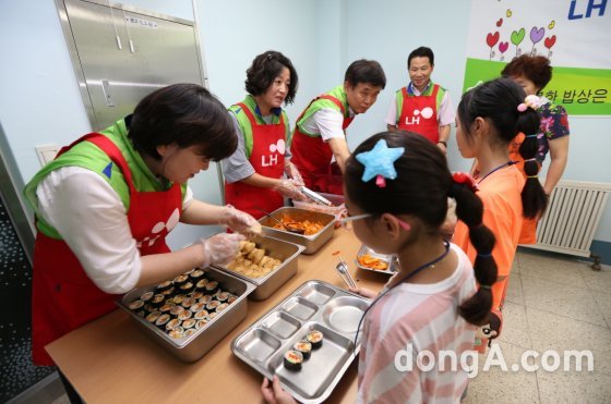 LH는 1일 경남 김해장유 율현13단지에서 행복한 밥상 봉사활동을 펼쳤다. LH 제공한국토지주택공사(이하 LH)는 여름 방학기간동안 임대주택단지 맞벌이부부가정 아동들에게 8월 한 달 간 점심을 제공한다고 1일 밝혔다. 대상은 전국 103개 국민임대주택단지의 아동 3100명이다.