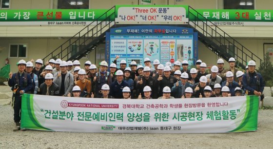 대우산업개발은 지난달 24일 경북대학교 건축공학과 학생 49명과 김화중 경북대학교 교수 겸 대경권 국토교통기술지역거점센터장, 천우영 대경권 국토교통기술지역거점센터 선임연구원이 시공현장을 견학하는 현장활동을 진행했다고 1일 밝혔다.