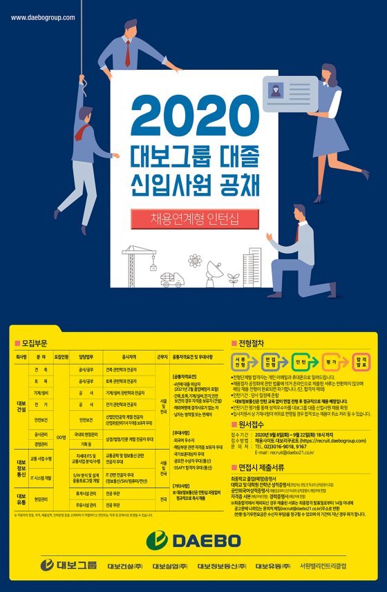 대보그룹은 대보건설, 대보정보통신, 대보유통 등 계열사 3곳에서 대졸 신입사원 공개채용을 실시한다고 7일 밝혔다.