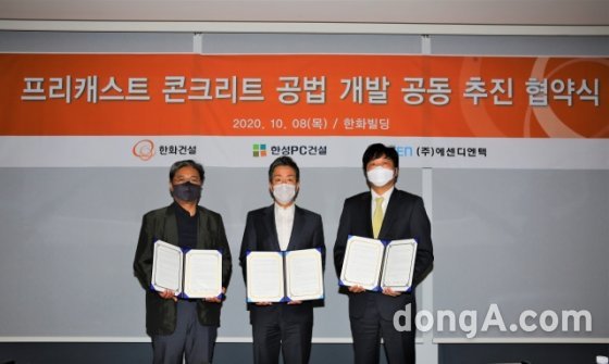 한화건설은 8일 서울 중구 장교동 한화빌딩에서 한성PC건설, 에센디엔텍과 ‘프리캐스트 콘크리트(PC) 공법 개발 공동추진 협약’을 맺었다고 밝혔다.