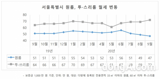스테이션3 다방 데이터 분석 센터 관계자는 “서울 원룸 평균 월세가 지난달에 이어 다시 한번 하락세를 보였다”며 “지난달에는 코로나19 재확산 이슈로 전·월세거래량이 감소한데다, 저금리 기조로 임차인들의 전세 선호현상이 지속되고 있기 때문”"이라고 말했다. 이어 "반면 집값 상승 및 정책 변화로 인해 소형 아파트를 대체할 수 있는 투·스리룸 시장이 오름세를 보인다“고 덧붙였다.