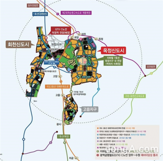 옥정신도시(706만㎡)는 계획인구 10만명의 경기북부 대표 거점이다. 교통여건은 지난해 12월 지하철 7호선 연장 공사가 착공, GTX-C 노선 또한 개통이 예정돼 있다.