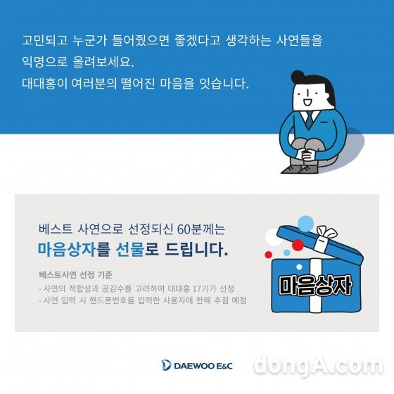 대우건설은 대학생 홍보대사(대대홍)와 함께 신개념 온라인 CSR인 ‘마음대교’ 캠페인을 진행한다고 3일 밝혔다.