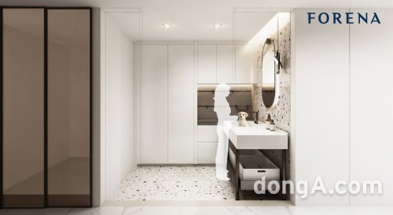 포레나 펫 프렌즈 인테리어는 현관 출입문 바로 옆에 욕실과는 별개로 공간을 마련해 산책 후 편리하게 반려동물을 씻길 수 있도록 인테리어를 디자인했다. 또한 반려동물에 대한 가장 큰 민원 중 하나인 소음을 줄이기 위해 슬라이딩 중문을 적용했다.