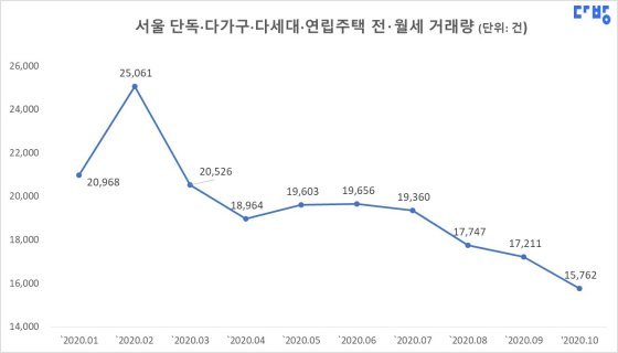 부동산 플랫폼 다방이 국토부 실거래 데이터를 분석한 결과 2020년 10월 단독(다가구)·다세대·연립주택의 전·월세 거래량은 총 1만5762건으로 전달 대비 8.4%(1449건) 감소한 반면 매매 거래는 5326건으로 전달 대비 11.1%(530건) 증가했다고 9일 밝혔다.