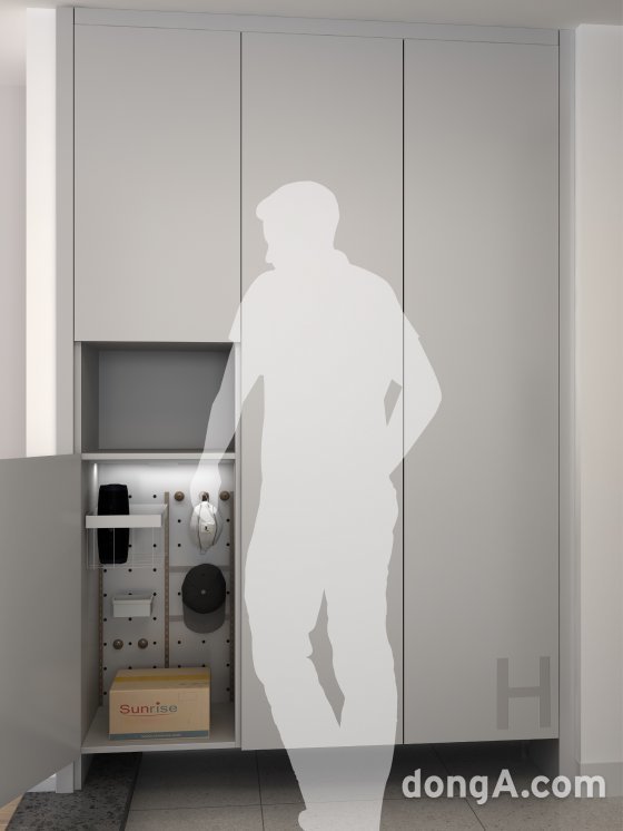 현관창고형은 현관 수납장을 벽부형 시스템 가구로 설치해 문을 기존 여닫이가 아닌 폴딩도어로 장착함으로써 공간활용을 극대화한 형태다. 아동용품, 골프백 등 부피가 큰 물건들도 편리하게 수납할 수 있다. 해당 모델을 적용해 수납장을 일정 깊이 확보하면 입주민은 현관에 의류관리기도 설치해 사용 할 수 있다.