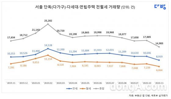 부동산 플랫폼 다방이 7일 국토교통부 실거래 데이터를 분석한 결과 지난해 11월 단독(다가구)·다세대·연립주택의 전·월세 거래량은 1만4983건으로 전월 대비 16.23%(2902건) 줄었다. 매매량도 5022건으로 전월 대비 7.73%(388건) 감소했다. 특히 전·월세 거래량의 경우 지난 2019년 11월부터 2020년 11월까지 최근 1년간 집계한 월별 수치 중 가장 낮았다.