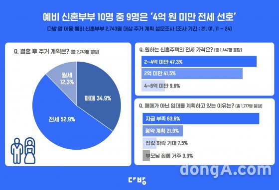 27일 다방이 예비 신혼부부 2743명을 대상으로 실시한 설문조사 결과에 따르면 전체 응답자의 절반이 넘는 52.9%(1450명)가 신혼주택으로 전세를 선호했다.
