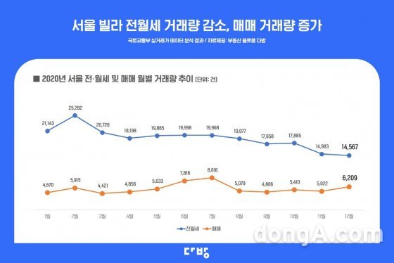 이에 반해 서울 빌라 전·월세 거래량은 줄어든 것으로 나타났다. 지난 12월 집계된 거래량은 총 1만4567건. 전달 1만4983건보다 2.78% 감소한 수치다. 지난해 월별 수치 중 최저치다. 특히 전세 거래의 감소폭이 컸다. 12월 전세 거래량은 8,474건으로 전월 대비 4.99% 줄었다.