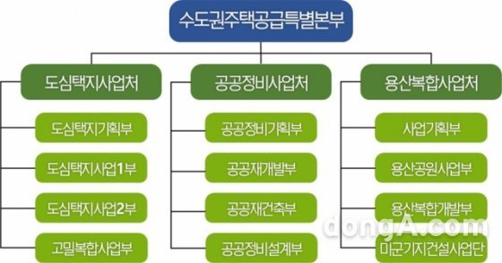 수도권 주택공급 특별본부는 기존 ‘총괄기획단’ 및 ‘공공정비사업단’ 2처 4부 체제에서 확대돼, 역세권 등 도심 공공주택 복합사업을 위한 ‘도심택지사업처’, 재개발‧재건축 등 공공시행 정비사업을 담당하는 ‘공공정비사업처’, 용산권 복합개발 등을 수행하는 ‘용산복합사업처’ 등 3처 12부 체제로 운영된다.