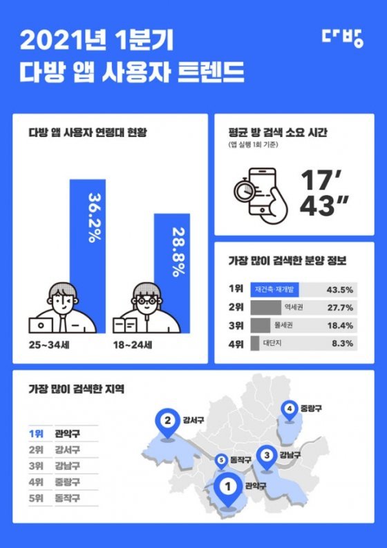 다방 이용자가 가장 많이 검색한 서울 지역은 관악구(37.1%)로, 원룸이 밀집한 신림동과 봉천동으로 확인됐다. 이들 지역이 포함 된 관악구는 청년 인구 비율이 전국에서 가장 높다(40.3%). 그 다음 △5호선 라인으로 여의도 직장인들의 수요가 많은 화곡동이 위치한 강서구(16.8%) △역삼동과 논현동 검색이 높은 강남구(15.4%) △다세대·다가구가 밀집한 면목동이 위치한 중랑구(8.7%) △트리플 역세권과 급행버스로 교통이 편리한 사당동이 위치한 동작구(4.8%) 등이 꼽혔다.