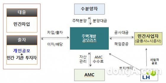 건설사·금융사 컨소시엄으로 구성된 민간사업자가 리츠(REITs)를 설립하고, 리츠에서 LH 공동주택용지를 매입해 주택을 건설·분양하는 주택개발리츠의 기본 사업구조를 유지하되, 리츠 자본조달 과정에서 국민을 대상으로 한 주식 공모 비중을 확대해 국민이 리츠 사업의 주주로 참여해 배당금을 지급받는 방식이다.
