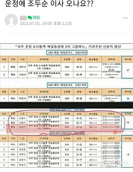 지난 2일 부동산 관련 커뮤니티 여러 곳에서는 파주 운정신도시 제일풍경채 2차 그랑베뉴의 기관추천 선정자 명단 중 84㎡A 타입 당첨 확정자에 ‘조*순’이라는 이름이 기재된 이미지 포함된 게시글이 다수 게재됐다.