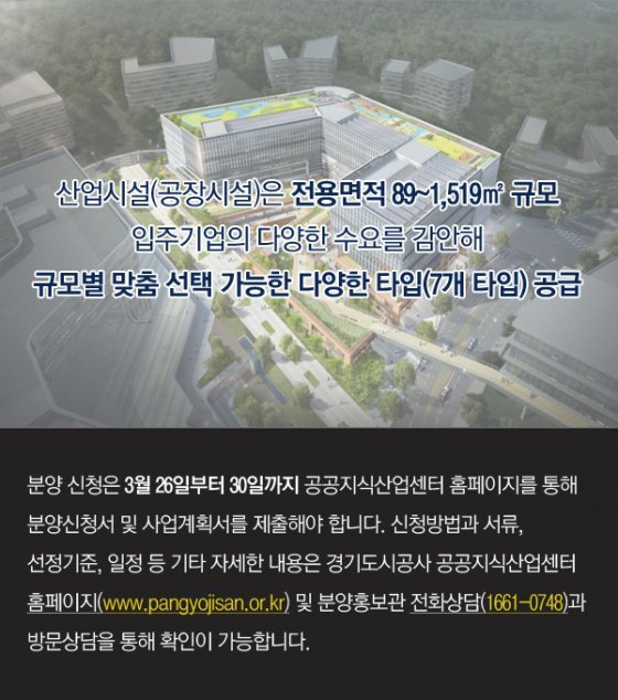 이러한 판교 제2테크노밸리 중심에 공공 주도의 지식산업센터가 들어섭니다. 경기도시공사가 분양하는 '판교 제2테크노밸리 공공지식산업센터'는 판교 최대 규모로, 창업·벤처 입주공간인 기업성장센터로 판교 지역 랜드마크로 떠오를 것으로 예상되는데요. 공공지식산업센터는 첨단제조업, 지식·문화산업 등 신(新)산업 선도 기술을 보유한 혁신기업 입주를 추진할 예정이어서 판교테크노밸리 및 입주기업들 간의 시너지 창출도 이뤄질 것으로 보입니다.
