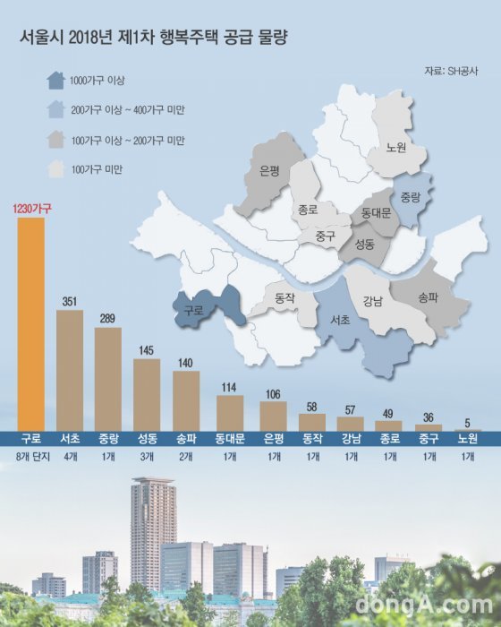 중랑구는 289가구로 공급 물량이 세 번째로 많다. 신내 3지구 4단지 도시형생활주택 1개 단지에 전용 22.0~31.9㎡, 4개 타입이 선보일 예정이다. 성동구는 금호 15구역(72가구)과 20구역(40가구), 행당 6구역(36가구) 등 3개 단지에 총 145가구가 공급되며 전 가구가 신혼부부에게 배정된다. 이어 송파구 140가구(2개 단지), 동대문구 114가구(1개 단지), 은평구 106가구(1개 단지), 동작구 58가구(1개 단지), 강남구 57가구(1개 단지), 종로구 49가구(1개 단지), 중구 36가구(1개 단지), 노원구 5가구(1개 단지) 순이다.
