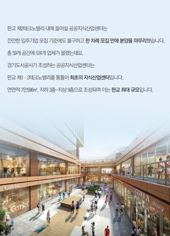 판교 제2테크노밸리 내에 들어설 공공지식산업센터는 깐깐한 입주기업 모집 기준에도 불구하고 한 차례 모집 만에 분양을 마무리했습니다. 총 59개 공간에 124개 업체가 몰렸는데요. 경기도시공사가 조성하는 공공지식산업센터는 판교 제1·2테크노밸리를 통틀어 최초의 지식산업센터입니다. 연면적 7만 598㎡, 지하 3층~지상 9층으로 조성되며 이는 판교 최대 규모입니다.