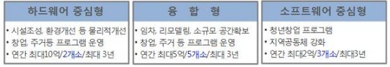 하드웨어 중심형은 시설조성과 환경개선 등 물리적 개선과 창업, 청년주거 등 프로그램운영이 수반되는 것으로 최대 30억 원을 지원해 3년간 사업을 추진한다. 융합형은 소규모 공간 확보나 리모델링, 창업, 청년주거, 상권 활성화 등 프로그램운영이 수반되며 최대 15억 원이 지원된다. 소프트웨어 중심형은 청년창업이나 교육, 지역공동체 강화 등 프로그램 운영중심으로 최대 6억 원을 지원하고 대학·자치구와 3년간 사업을 추진할 예정이다.