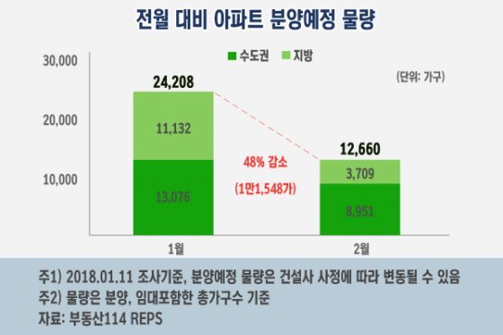 부동산114에 따르면 2월에는 전국에서 1만2660가구(임대포함)가 분양될 예정이다. 이는 전월(2만4208가구)과 비교해 48%(1만1548가구) 감소한 것이다. 건설사들이 평창동계올림픽, 설날 등으로 수요자의 관심이 분산되는 2월을 피해 분양일정을 조율하고 있는 것으로 풀이된다.