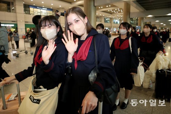 일본 구마모토현 루테루 고등학교 학생과 교사 37명이 21일 오후 인천국제공항을 통해 입국해 손을 흔들며 인사 하고 있다. 4박 5일 일정으로 방한한 일본 청소년들은 자매학교인 전주 신흥고등학교의 학생들을 만나 수업을 참관하고, 전주 한옥마을을 비롯해 진안 마이산, 서울타워, 남대문, 명동, 경복궁, 롯데월드 등을 여행할 예정이다. 양회성 기자 yohan@donga.com