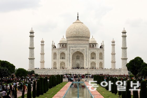 붉은 사암으로 치장한 타지마할의 아치형 정문.타지마할은 1983년 ‘이슬람 예술의 보석’이라는 찬사를 받으며 유네스코 세계문화유산으로 지정됐다. 2007년에는 세계의 경이적인 문화유산 7개 중 하나로 선정되면서 더욱 유명해졌다. 인공으로 만든 기단 위에 67m 높이의 양파 돔과 40m 높이의 4개 첨탑, 그리고 아치형 벽감으로 온몸을 치장하고 있는 영묘는 천상의 궁궐을 표현해 놓은 듯하다.