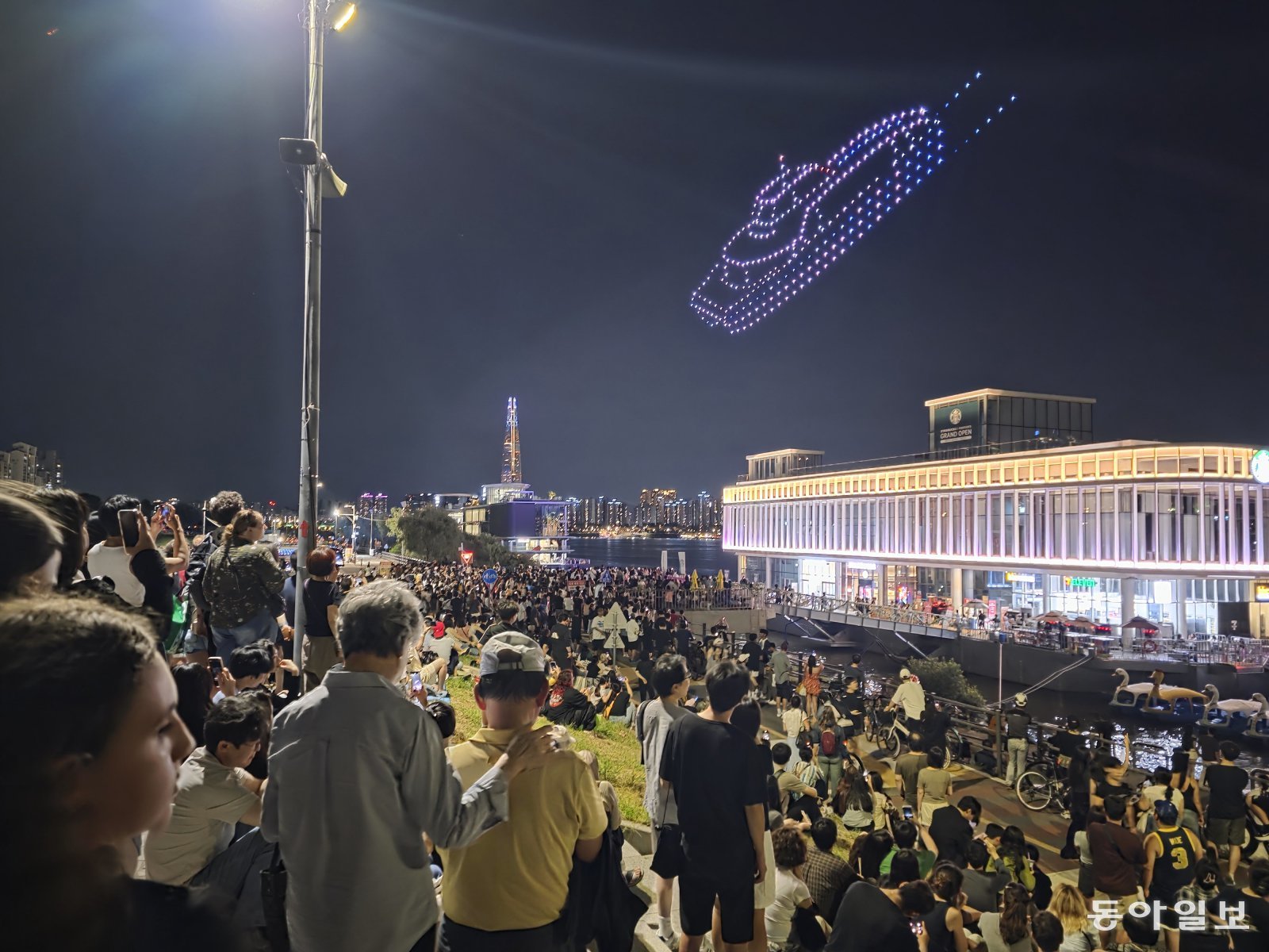 뚝섬한강공원에서 10월 말까지 펼쳐지는 서울드론라이트쇼. 14일 서울 광진구 자양동 뚝섬한강공원. 오후 8시 예정된 서울드론라이트쇼를 보러 낮부터 인파가 밀려들었다. 앞서 7일 케데헌 OST에 맞춰 드론 2000대가 헌트릭스와 사자보이즈 캐릭터로 밤하늘을 수놓은 이후 주말마다 장관을 이룬다.