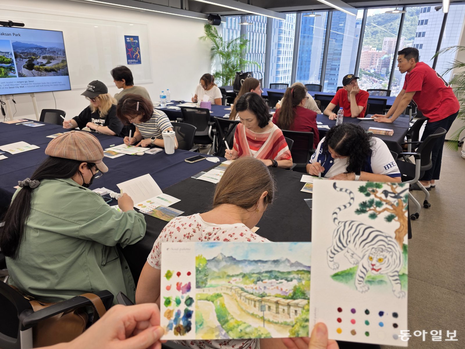 서울관광재단 11층 서울컬쳐라운지에서 외국인들이 낙산공원 성곽길 그리기 체험을 하고 있다. |
