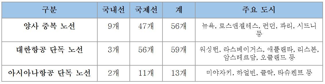 대한항공과 아시아나항공 노선 운영 현황소비자 효익 극대화… 아시아나 마일리지 선택권 확대