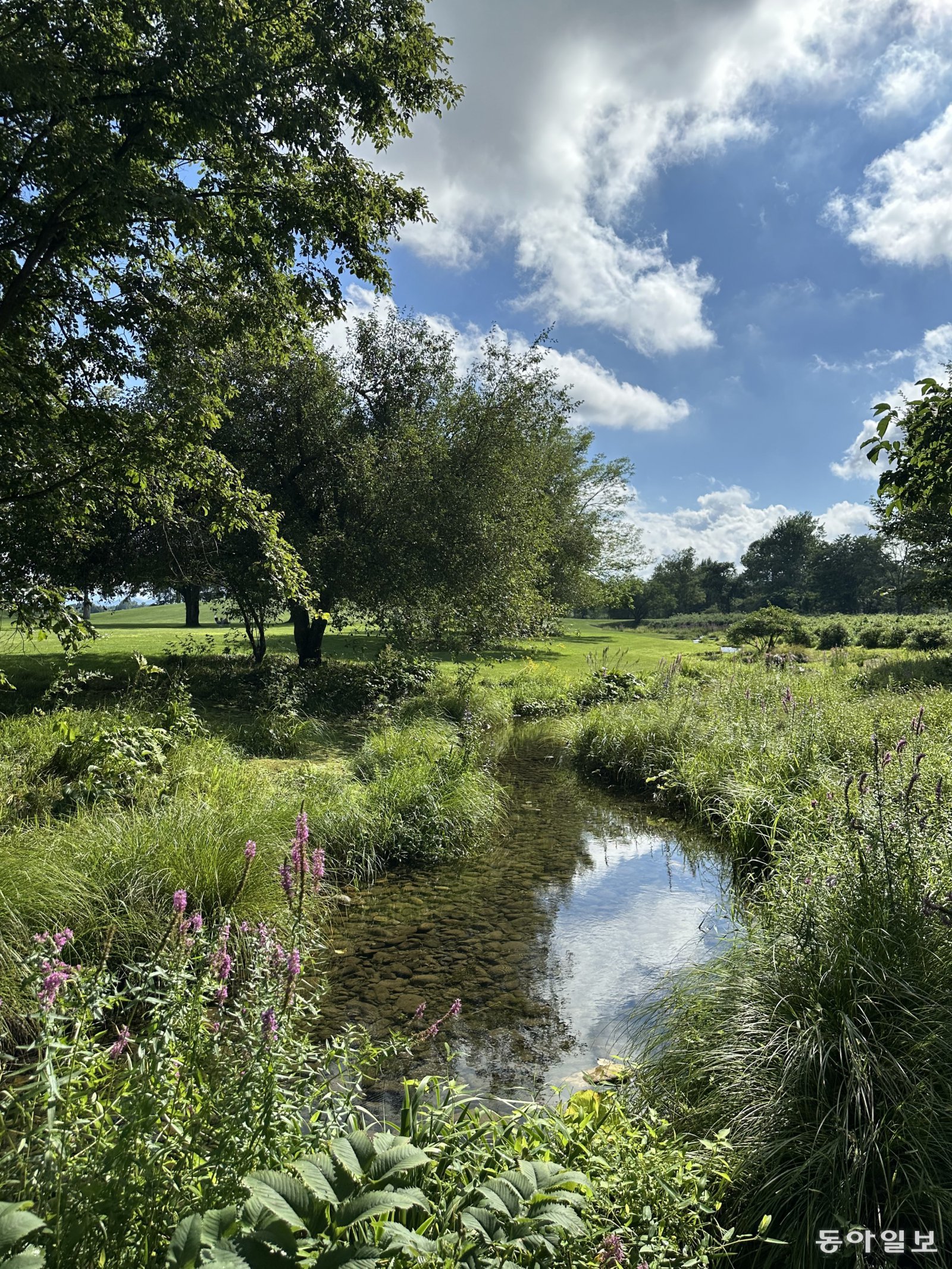 마음을 차분하게 정돈해주는 곳이었어요. 언덕과 숲 사이로 졸졸 흐르는 물은 투명하리만큼 맑았어요. 그래서 물속에서 출렁이는 풀이 마치 머리를 감는 듯 보였나 봐요. 작은 오두막 갤러리들에는 지역 자연을 그린 그림이 걸려 있고, 카페에서는 지역 농축산물로 만든 음료와 과자를 내놓았습니다. 한국에서 자연농법을 실천하는 분은 “한국에서는 우유를 안 마시지만, 환경이 건강한 이곳에서는 안심하고 마실 수 있겠다”고 했어요. 정원은 지역과 삶을 지켜내는 실천이었습니다.