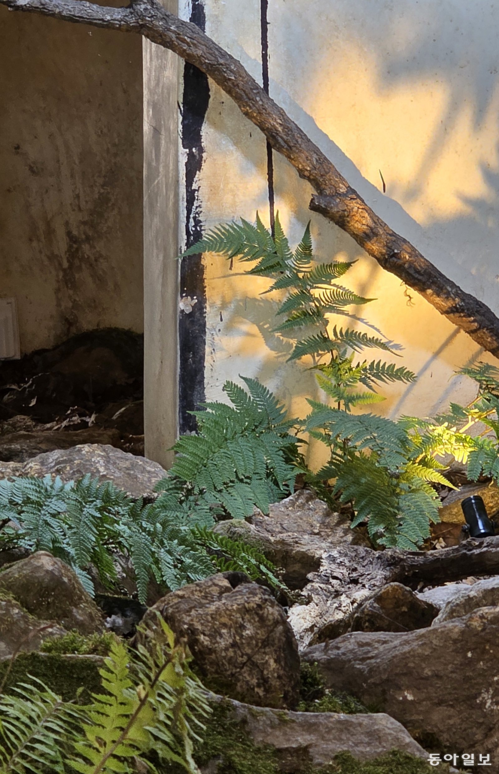 곰이 떠난 자리에 식물이 들어섰다. 포천=김선미 기자 kimsunmi@donga.com벽체 일부를 걷어내 숲의 경관을 끌어들인 옛 사육장엔 자생식물이 들어섰다. 빛이 스며들 때 그림자가 아름다운 식물을 심은 섬세함이 돋보였다. 여전히 빛이 거의 닿지 않는 곳에는 이끼나 버섯으로 감금의 시간을 은유했다. 사육사가 곰의 출산을 지켜보던 벽체의 작은 구멍에 눈을 갖다 대니, 루페(확대경) 렌즈를 통해 안쪽 식물이 손에 잡힐 듯 보였다. 깊은 주의를 기울여 바라보자 식물의 생명력을 새삼 알아차리게 됐다. 정원은 기억 위에 생명을 불어넣었다.