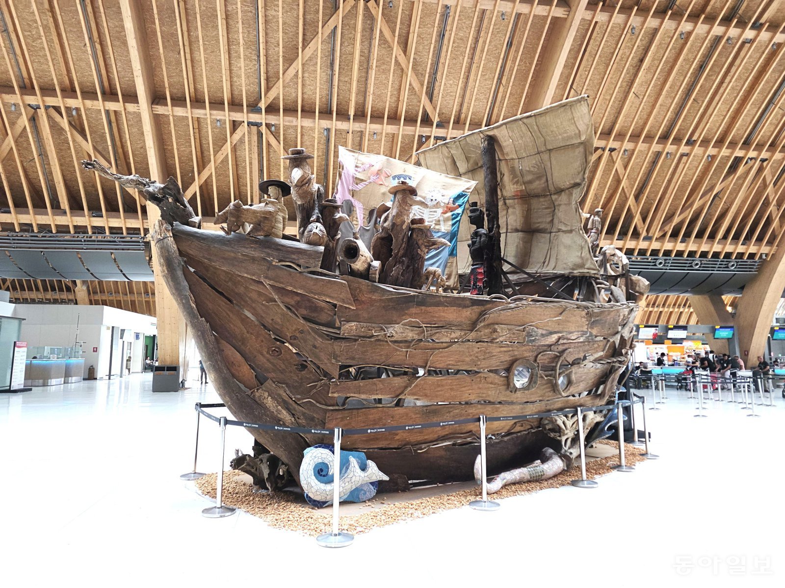 막탄-세부국제공항 활주로에 계류 중인 세부퍼시픽 항공. 전승훈 기자 raphy@donga.com수천 개의 작은 나무 갈비뼈들이 결합된 목재로 지어진 파도 모양의 지붕과 뒤집힌 배처럼 보이는 나무 아치 구조가 눈길을 끈다.