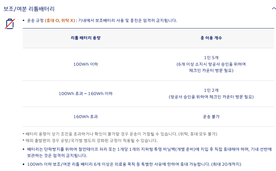 기내 보조배터리 반입 허용 규정일각에서는 기내 반입 보조배터리 용량·개수 규정을 강화해야 한다는 의견도 나온다. 현행 규정에 따르면 보조배터리는 위탁수화물에 넣을 수 없고 기내 휴대만 가능하다. 기내 반입 허용 용량이나 개수는 배터리 용량 100wh 이하 제품을 1인 5개까지 소지할 수 있다. 100~160wh 이하 제품은 2개까지 허용된다. 160wh 초과 제품은 반입이 금지된다. 일반적으로 소비자들이 사용하는 보조배터리 용량은 밀리암페어시(mAh)나 Ah(암페어시)로 표시되는데 1만mAh(10Ah) 제품을 wh로 환산하면 37wh에 불과하다. 2만mAh 제품은 74wh 수준이다. 승객 한 명이 최대 2만mAh 넘는 보조배터리 5개를 기내에 반입할 수 있는 것이다.