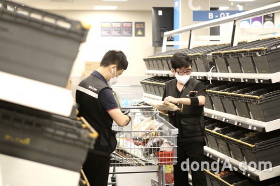 이마트 이천점 PP센터에서 작업자가 DAS에 도착한 상품을 배송 바스켓으로 옮기는 모습.
