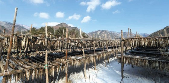 12월 말부터 이듬해 3월 중순까지 총 4000여만 마리의 황태가 건조되는 용대리의 한 황태덕장 풍경.