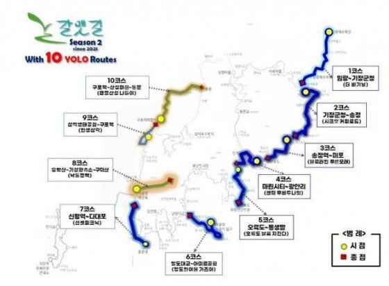 부산 YOLO 갈맷길 노선도(부산시 제공)© 뉴스1부산시는 1일 갈맷길 관광특성화 걷기여행 노선 ‘YOLO 갈맷길 10선’을 선정·발표하고 본격적인 홍보를 추진한다고 밝혔다.