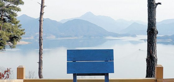 카페 ‘호수가 아름다운 전망대’에서 바라본 충주호반과 월악산 영봉(뒤쪽 가운데 산).삼등산 중 휴양촌이 들어서는 조동근린공원은 지등산의 끝자락에 위치해 있다. 봄에는 벚꽃이 흐드러지게 피어나는 벚꽃동산으로 유명한 이곳은 호젓하게 즐길 수 있는 산책 코스다. 잘 다듬어진 산책로를 따라 걷다 보면 지등산의 땅 기운을 덤으로 받는 체험을 할 수 있다.
