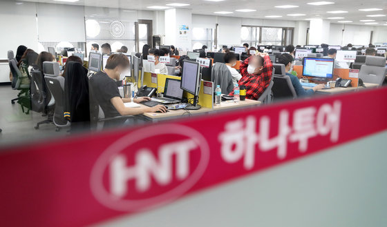 서울 종로구 하나투어 본사에서 직원들이 업무를 보고 있는 모습. 2021.10.12/뉴스1 © News1 한편 이날 오전 중앙재난안전대책본부는 오는 21일부터 국내와 해외에서 백신 접종을 완료하고, 접종 이력 등록자에 대해서 기존에 시행한 ‘해외입국자 7일 격리’를 면제한다고 발표했다.