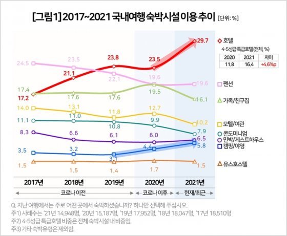 호텔은 2017년 이용 점유율 17.2%로 펜션(24.5%)에 크게 뒤졌으나 호캉스 붐에 힘입어 2019년 처음으로 펜션을 앞질렀다. 코로나가 시작된 2020년 잠시 주춤하면서도 1위 자리를 지키더니 지난해에는 29.7%로 전년 대비 6.2%포인트 수직 상승했다. 코로나 전부터 불기 시작한 호캉스 열풍에 안전과 위생을 중시하고 타인과의 접촉을 최소화하는 코로나 시대 여행 트렌드가 더해지며 상승했다. 억제됐던 보복소비 심리도 한몫 했을 것으로 보인다. 실제 지난해 4성급 이상 호텔 점유율은 16.4%로 전년보다 4.6%포인트 늘었다.