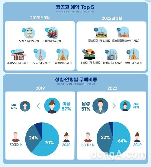 항공권 구매층 변화도 주목할 만하다. 2019년 43%에 그쳤던 남성고객 비중이 올해 처음으로 절반(51%)을 넘어서면서 여성고객 수요를 앞질렀다. 특히 50대 이상 고객 비중이 3년 전 24%에서 이번에 32% 수준으로 크게 증가했다. 중년 남성이 가족여행을 위해 과감하게 지갑을 연 것으로 해석할 수 있다.