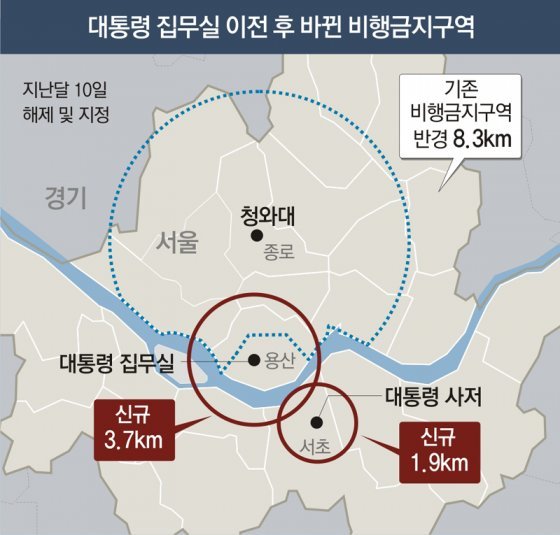 반면 집무실 이전으로 드론 비행이 불가능해진 곳도 있다. 정부는 지난달 10일 서울 용산구 대통령 집무실 반경 약 3.7km(2해리)를 비행금지구역으로 정했다. 청와대보다 비행금지구역이 줄어든 건 한강 남쪽 항로를 이용하는 항공편에 영향을 주지 않기 위해서라고 한다.