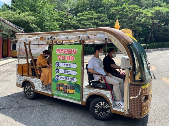 행주관람차는 행주산성 안을 순환하는 2대(6인승·9인승)의 전기차로, 휠체어 이용객도 탑승할 수 있다.