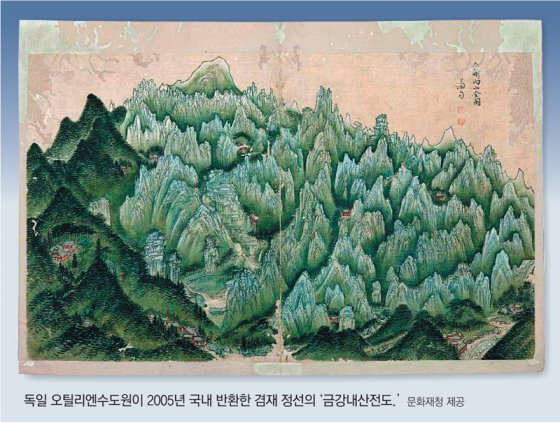 하늘에서 내려다보듯 금강산의 절경이 한눈에 펼쳐진다. 가로 54.3cm, 세로 33cm 화폭에 울창한 소나무 숲이 우거진 산봉우리가 겹겹으로 그려져 있다. 겸재 정선(1676∼1759)이 환갑 무렵 그린 진경산수화 ‘금강내산전도’다. 1925년 한국을 찾은 독일의 성 오틸리엔 수도원 노르베르트 베버 대원장이 이 작품이 포함된 ‘겸재정선화첩’을 수집해 반출했다. 2005년 성 오틸리엔 수도원이 수장고에 잠들어 있던 화첩을 영구대여하는 방식으로 한국에 반환하면서 ‘금강내산전도’는 80년 만에 고국의 품으로 되돌아왔다. 당시 성 오틸리엔 수도원의 예레미아스 슈뢰더 신부는 반환 의사를 밝히며 이렇게 말했다. “겸재정선화첩이 더 많은 사람에게 깊은 감동을 줄 수 있는 곳에 있기를 바랍니다.”