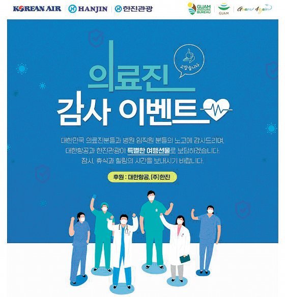 한진그룹이 코로나19 방역 최전선에서 활약한 의료진에게 통 큰 혜택을 선보였다. 한진관광은 코로나19 최일선에서 방역 노력을 펼친 의료진을 위한 괌 무료 여행 이벤트, 유럽여행 할인 이벤트를 기획해 성공적으로 마무리했다. 이벤트는 한진관광과 한진그룹의 주력 기업인 ㈜한진, 대한항공, 괌 관광청의 후원을 통해 이루어졌다.