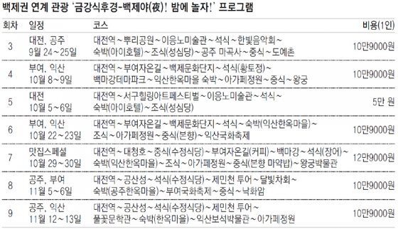 4개 코스 모두 야간 관광이 핵심이다. 대전에선 한빛탑 광장 물빛정원의 음악분수쇼와 미디어파사드를 비롯해 공주 제민천의 야간 투어 및 달빛차회, 부여에서는 백마강테마파크 관람 등이 마련돼 있다. 일정 중에는 ‘풀꽃시인’ 나태주 선생과의 만남, 백마강 수륙양용버스 체험, 대전 서구힐링아트페스티벌 및 부여·익산국화축제 관람도 포함돼 있다.